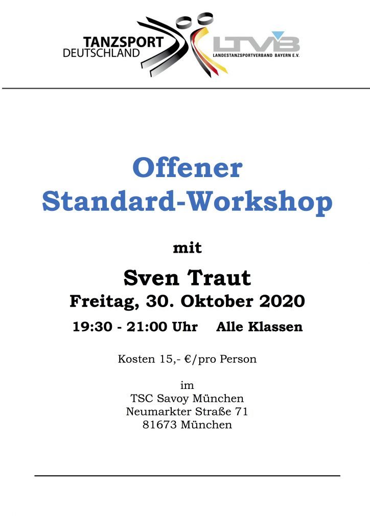 Gruppentraining am Montag, 19. Oktober Möglichkeit für Privatstunden am Sonntag, 18. Oktober, Montag, 19. Oktober und Dienstag, 20. Oktober. Anmeldung unter: privatstunden-standard@savoy-muenchen.de